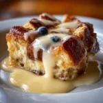 A cozy comfort dessert made from stale bread soaked in rich custard and drizzled with sweet vanilla sauce.