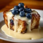 - Serve warm bread pudding drizzled with vanilla sauce.