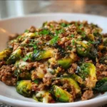 A healthy and delicious one-pan meal featuring sautéed Brussels sprouts and ground turkey, perfect for busy weeknights.