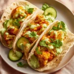 A spicy and crunchy wrap featuring roasted cauliflower coated in buffalo sauce, fresh vegetables, and creamy avocado.