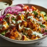 A vibrant and flavorful blend of roasted cauliflower, fresh veggies, and grains, topped with a creamy tahini drizzle.
