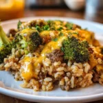 A comforting all-in-one dish combining tender beef, broccoli, and fluffy rice smothered in cheese.