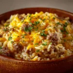 A warm and comforting casserole that combines savory hamburger meat, creamy cheese, and fluffy rice, perfect for family dinners or casual gatherings.