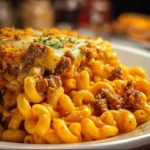 A comforting and delicious fusion of creamy macaroni and cheese with seasoned hamburger meat.