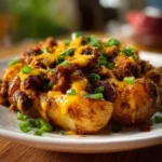 Comforting baked potatoes stuffed with ground meat, melty cheese, and your favorite taco toppings.
