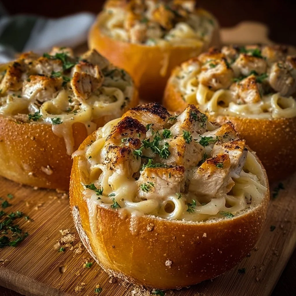 A delightful twist on traditional pasta dishes, featuring creamy alfredo sauce and tender chicken served in crispy garlic bread bowls.