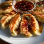 Delicious handmade chicken potstickers filled with seasoned chicken, veggies, and a hint of ginger or garlic.