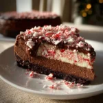 A festive dessert featuring layers of chocolate cake, creamy chocolate cheesecake, and a delightful candy cane crunch.
