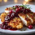 Juicy turkey fillets coated in a crunchy breadcrumb crust, paired with sweet and tangy cranberry sauce for a comforting meal.