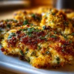 A delightful twist on chicken dinners with the tangy flavor of dill pickles and a crispy parmesan topping.