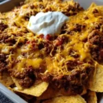 Delicious beef and cheese nachos, perfect for game day snacking. Load them up with toppings for a crowd-pleaser!