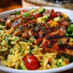 A vibrant and nutritious salad combining grilled chicken marinated in lemon and herbs with orzo pasta, avocado, and fresh veggies.