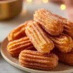 - While still warm, roll the churro bites in a mix of sugar and cinnamon for finishing.