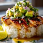 - Assemble the stack by layering rice, sliced chicken, and avocado. Drizzle with any leftover honey lime sauce.
