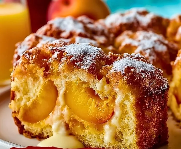 A scrumptious dessert showcasing juicy peaches in a moist and fluffy cake, perfect for summer gatherings.