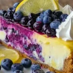 A creamy cheesecake with zesty lemon and sweet blueberries, creating a delightful dessert experience.