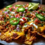 A deliciously cheesy plate of Loaded Chicken Nachos topped with shredded chicken, fresh veggies, and savory sauces.