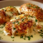 A cheesy, savory dish featuring tender chicken breasts smothered in a creamy Parmesan cheese sauce, baked to perfection.