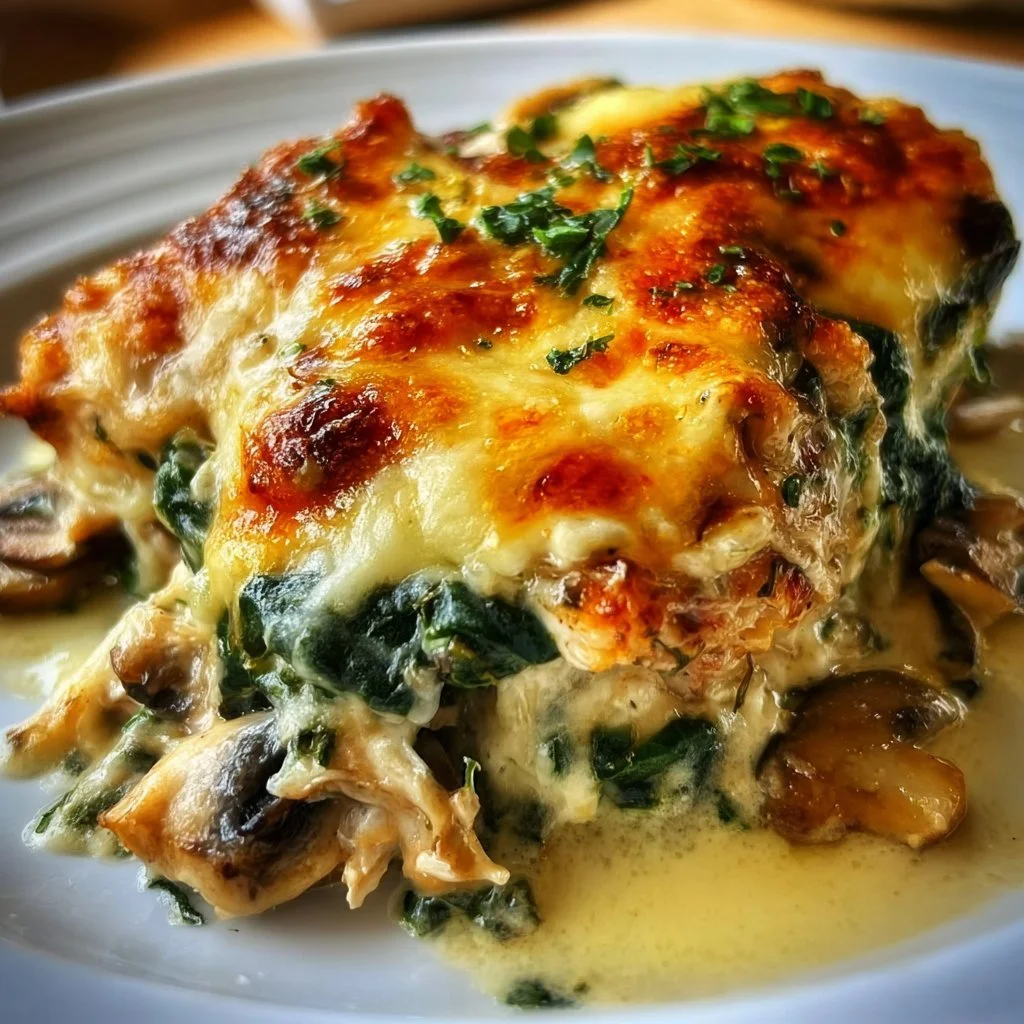 A creamy, savory casserole of tender chicken, fresh spinach, and earthy mushrooms, low in carbs but high in flavor.
