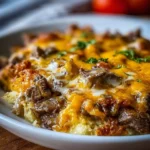 A hearty and comforting low-carb casserole packed with traditional Philly cheesesteak flavors, layered with steak, bell peppers, and creamy cheese.
