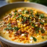 A comforting and creamy Mexican street corn soup inspired by elote, packed with flavors of sweet corn, zesty lime, and customizable toppings.