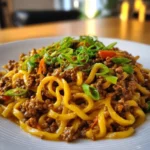 A warm and flavorful bowl of Mongolian Ground Beef Noodles, combining savory ground beef, fresh veggies, and chewy noodles in a delicious sauce.
