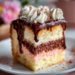 A delightful multi-layered cake combining the classic flavors of chocolate, vanilla, and strawberry, reminiscent of the beloved ice cream we all grew up enjoying.