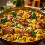 A flavorful and creamy dish featuring tender tortellini in a spicy garlic butter sauce with juicy chicken, all cooked in one pot for easy cleanup.