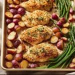 A delicious one-pan meal featuring tender chicken coated with a crunchy Parmesan crust, paired with colorful roasted vegetables.