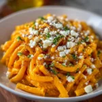 A comforting pasta dish with creamy pumpkin sauce and tangy feta, perfect for cozy evenings.