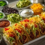 An interactive and colorful taco buffet spread that allows everyone to build their own delicious tacos with a variety of customizable ingredients.