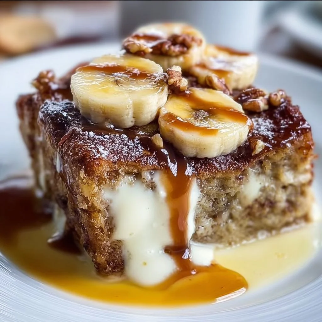A comforting dessert combining banana bread and creamy custard for a delightful treat.