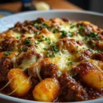 A hearty casserole of soft gnocchi smothered in rich bolognese sauce topped with melting mozzarella and parmesan cheese.