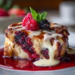 A delightful dessert featuring custard-soaked bread bursting with fresh berries, perfect for brunch or a family gathering.
